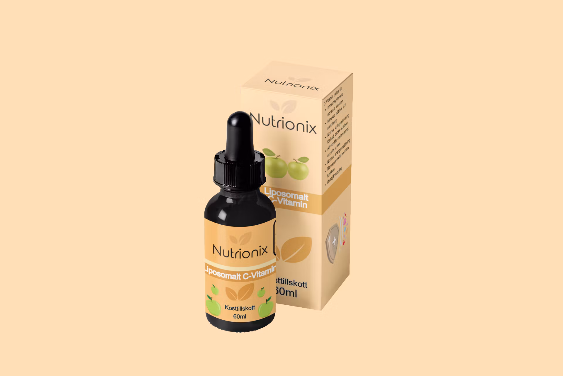 Liposomalt C-Vitamin i flytande form med god och naturlig smak av äpple, bara att droppa och dricka direkt.