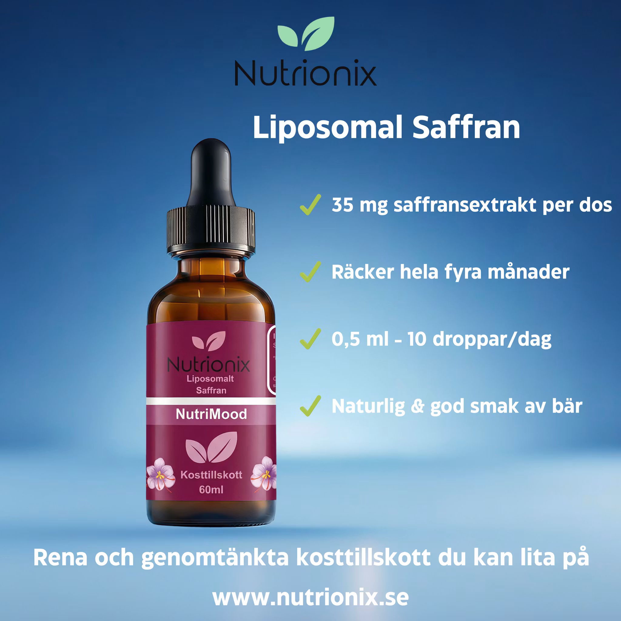 NutriMood innehåller 35 mg lättupptaglig liposomal saffran per dos, varsamt formulerad med högsta biotillgänglighet i fokus och för att passa alla i familjen. Genom liposomal teknologi inkapslas saffran i fosfolipider, vilket ger ett förbättrat upptag i kroppen jämfört med traditionella former. Liposomerna är uppbyggda av samma typ av fosfolipider som finns i kroppens egna cellmembran. Det gör att de effektivt kan passera tarmväggen och leverera näringsämnet direkt till blodomloppet. På Nutrionix vill vi att hela familjen ska kunna använda samma kosttillskott, därför är våra kosttillskott enkla att dosera med medföljande pipett baserat på ålder.