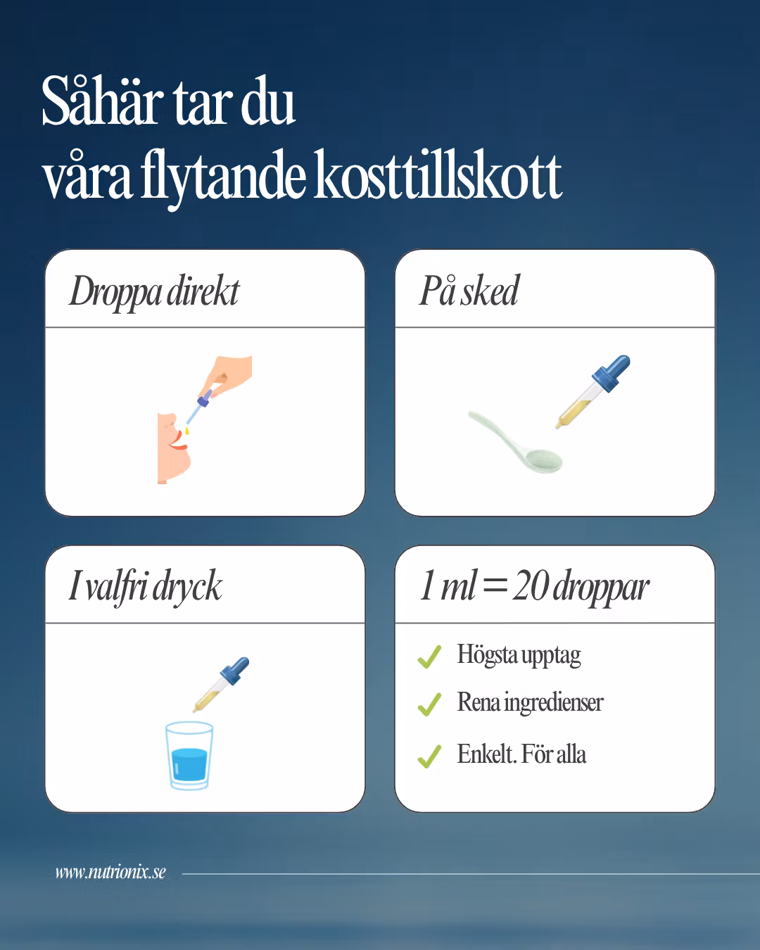Nutrionix Liposomal Magnesium innehåller 110 mg elementärt magnesium i formen magnesiumbisglycinat, en av de mest biotillgängliga och skonsamma formerna av magnesium. Varsamt formulerad med högsta biotillgänglighet i fokus och för att passa alla i familjen. Genom liposomal teknologi inkapslas magnesiumet i fosfolipider, vilket ger ett förbättrat upptag i kroppen jämfört med traditionella former. Liposomerna är uppbyggda av samma typ av fosfolipider som finns i kroppens egna cellmembran. Det gör att de effektivt kan passera tarmväggen och leverera näringsämnet direkt till blodomloppet. På Nutrionix vill vi att hela familjen ska kunna använda samma vitaminer och mineraler, därför är våra kosttillskott enkla att dosera med medföljande pipett baserat på ålder.